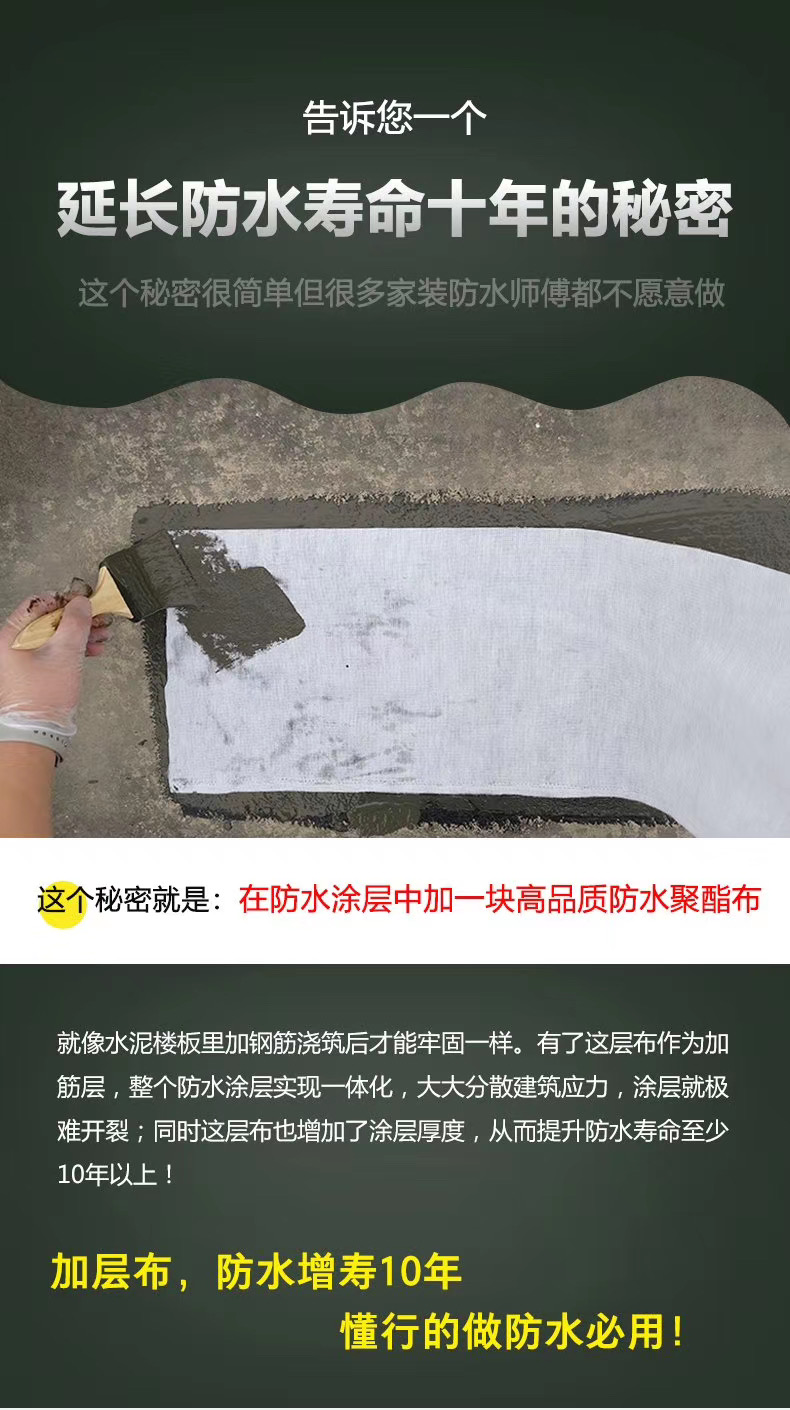 在防水涂層中加一層高品質(zhì)縫織聚酯布就像水泥樓板里加鋼筋澆筑后才能牢固一樣。有了這層聚酯布作為加筋層,整個防水涂層實現(xiàn)一體化,大大分散建筑應力,涂層就極難開裂;同時這層聚酯布也增加了涂層厚度,從而大大提升防水壽命至少10年以上。