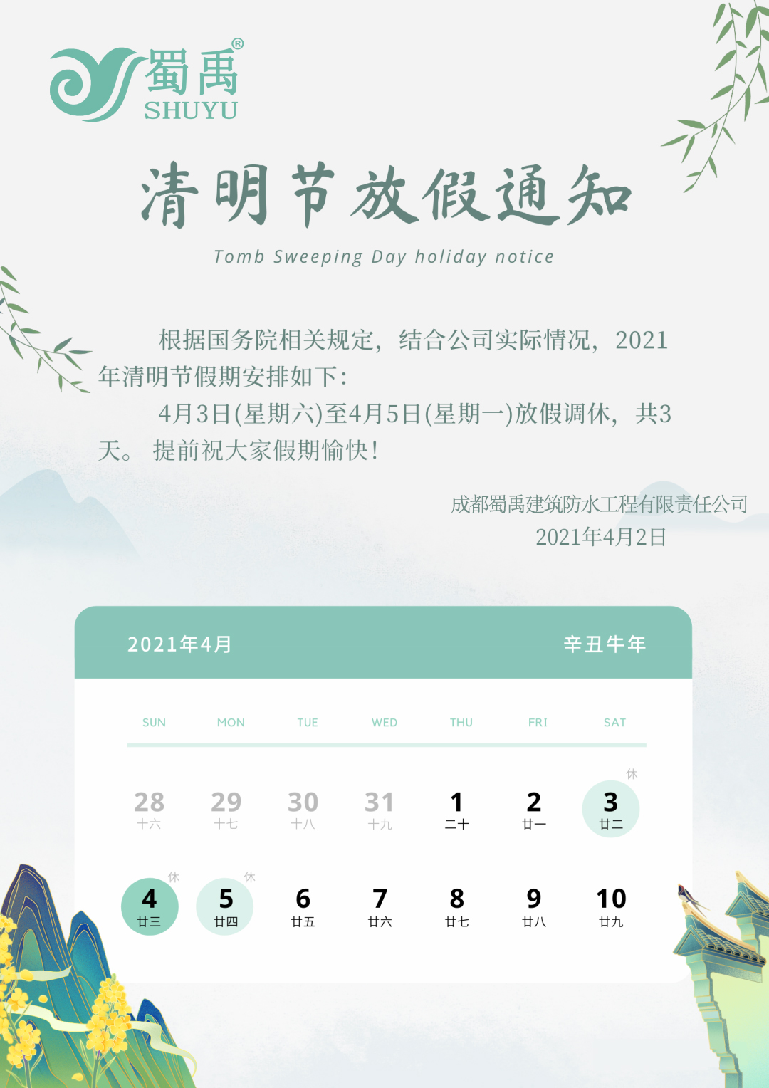 【通知】成都蜀禹建筑防水工程有限責任公司清明節放假通知!