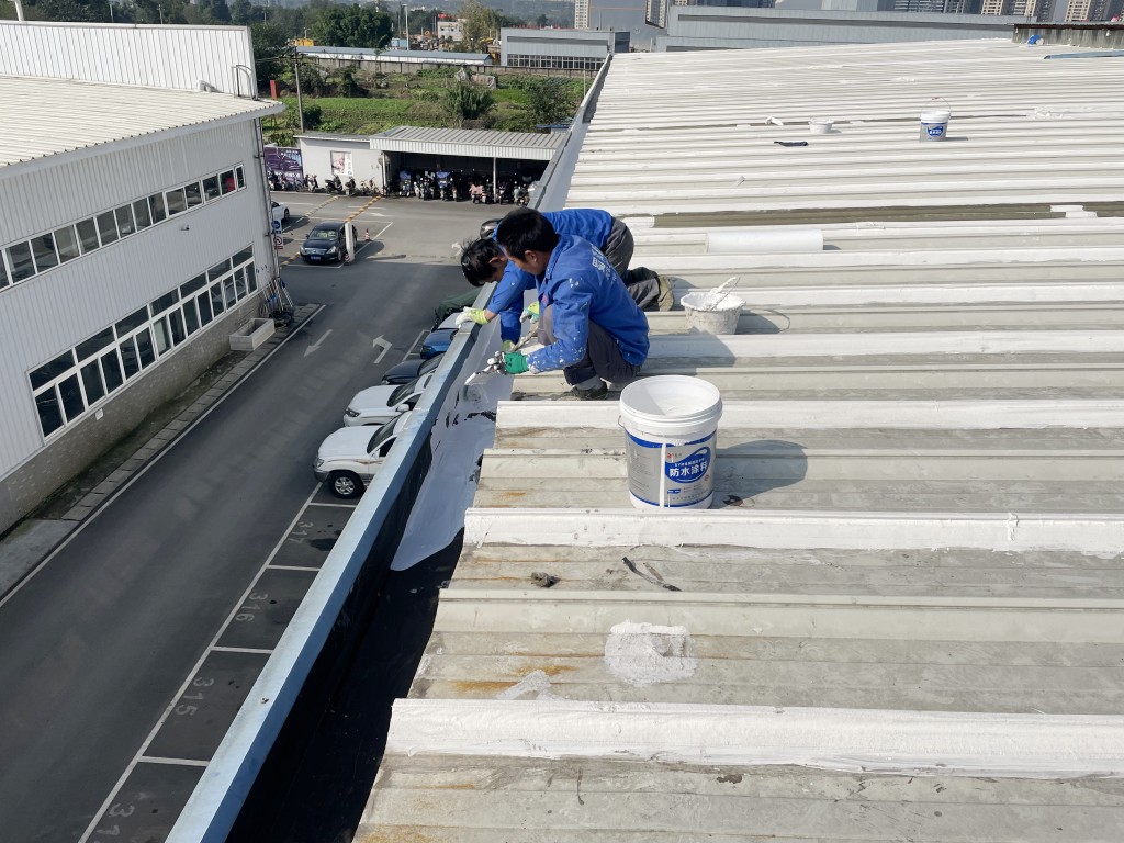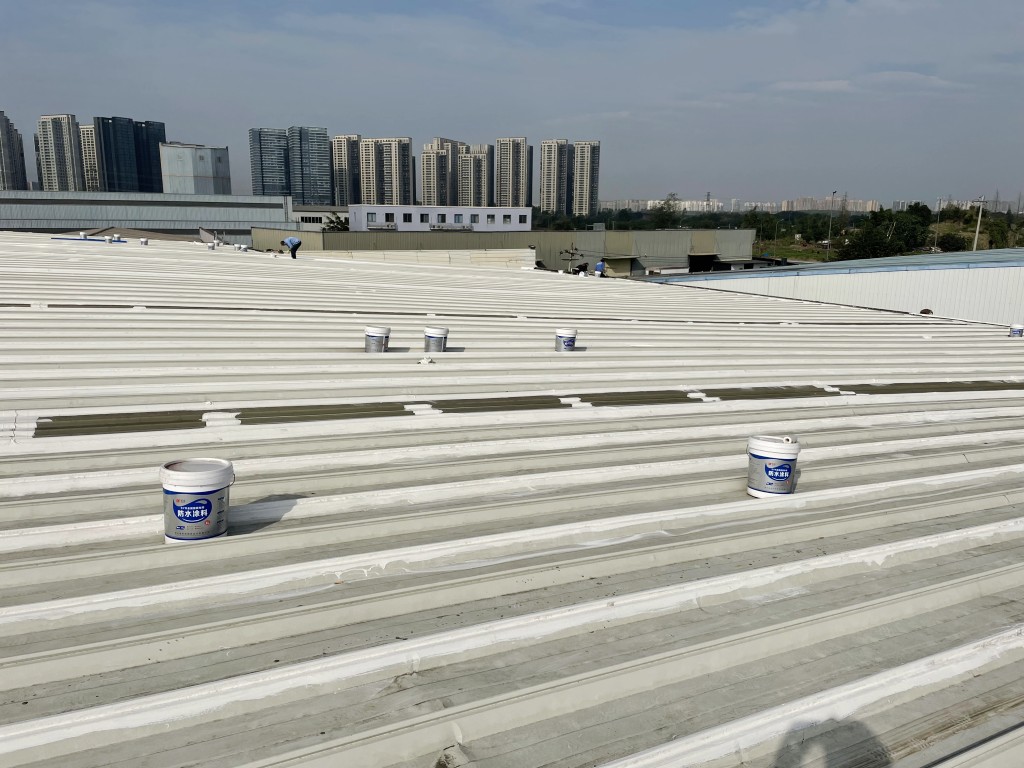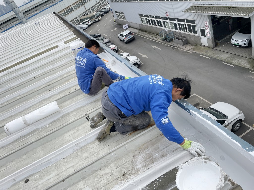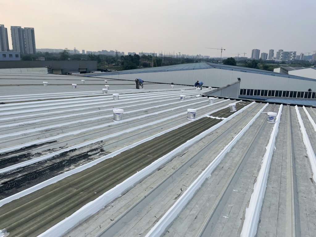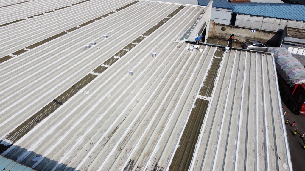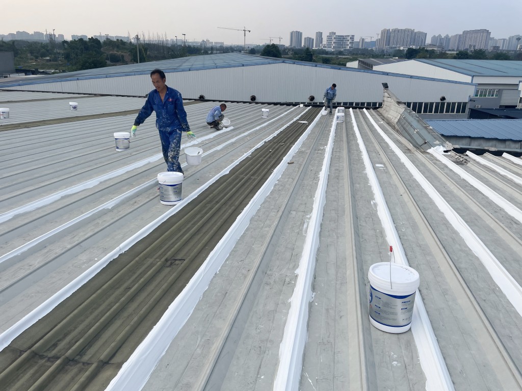 啟陽汽車華陽園區豐田鈑金車間與美容區及洗車區彩鋼頂防水工程由成都蜀禹建筑防水工程有限責任公司2021年8月進行施工,廠房為鋼結構的彩鋼頂,彩鋼頂漏水點位較多,并且豐田接車雨棚位置一塊區域彩鋼頂表面生銹了,先針對彩鋼頂進行防水處理之后此處還對彩鋼表面滿涂SYR金屬屋面防水系統進行防銹施工。此次針對此廠房頂部采用蜀禹SYR金屬屋面專用防水涂料配合專用縫織聚酯布進行施工處理,處理后經多次下雨檢驗驗收合格。