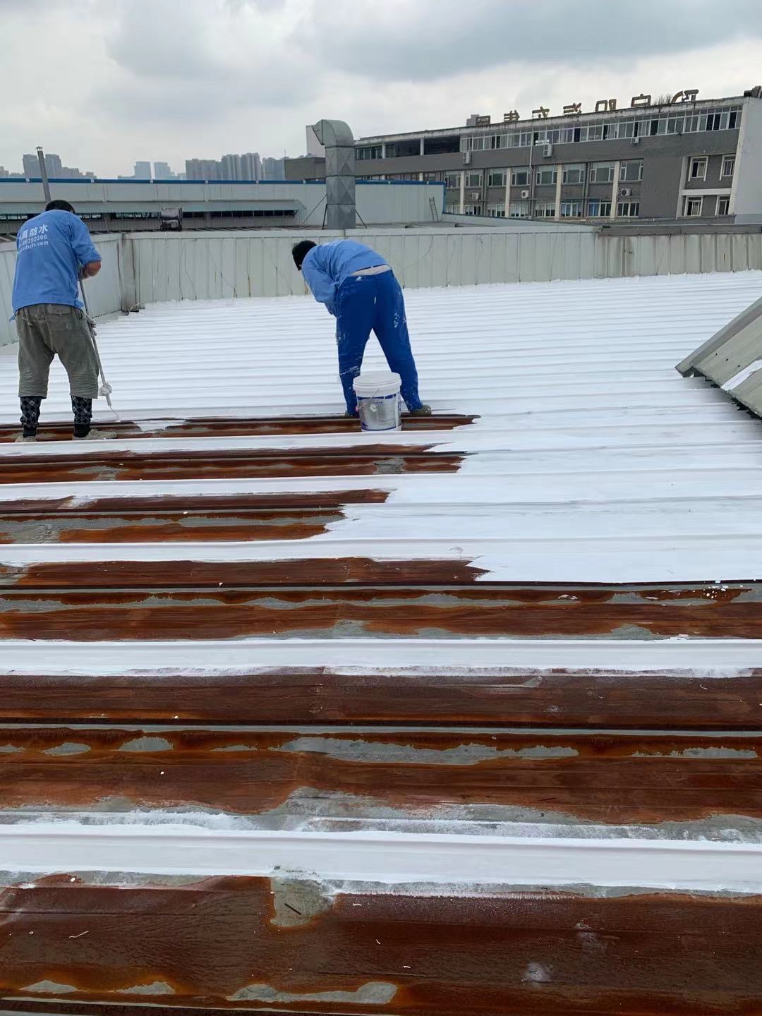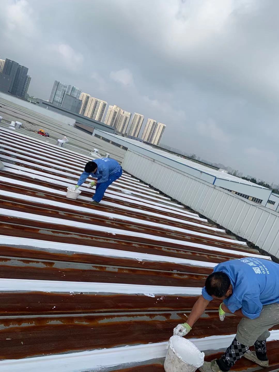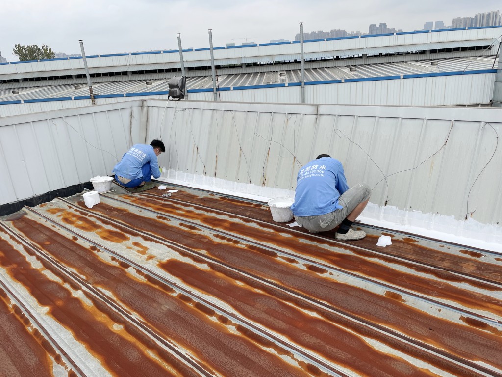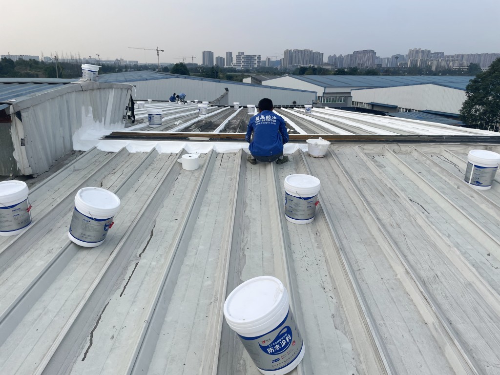 啟陽汽車華陽園區豐田鈑金車間與美容區及洗車區彩鋼頂防水工程由成都蜀禹建筑防水工程有限責任公司2021年8月進行施工,廠房為鋼結構的彩鋼頂,彩鋼頂漏水點位較多,并且豐田接車雨棚位置一塊區域彩鋼頂表面生銹了,先針對彩鋼頂進行防水處理之后此處還對彩鋼表面滿涂SYR金屬屋面防水系統進行防銹施工。此次針對此廠房頂部采用蜀禹SYR金屬屋面專用防水涂料配合專用縫織聚酯布進行施工處理,處理后經多次下雨檢驗驗收合格。