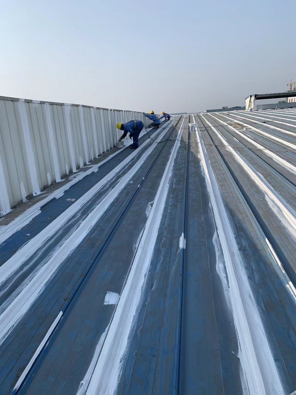 下面這些照片中就是我們公司現(xiàn)在施工的現(xiàn)場(chǎng),彩鋼板中間有破損孔洞的部位也是采用一布三涂的方式進(jìn)行防水密封處理了的,這樣處理了之后彩鋼頂形成了一個(gè)完整體,表面的水就不再漏到樓下室內(nèi)了。處理了之后下雨觀(guān)測(cè)效果很好。