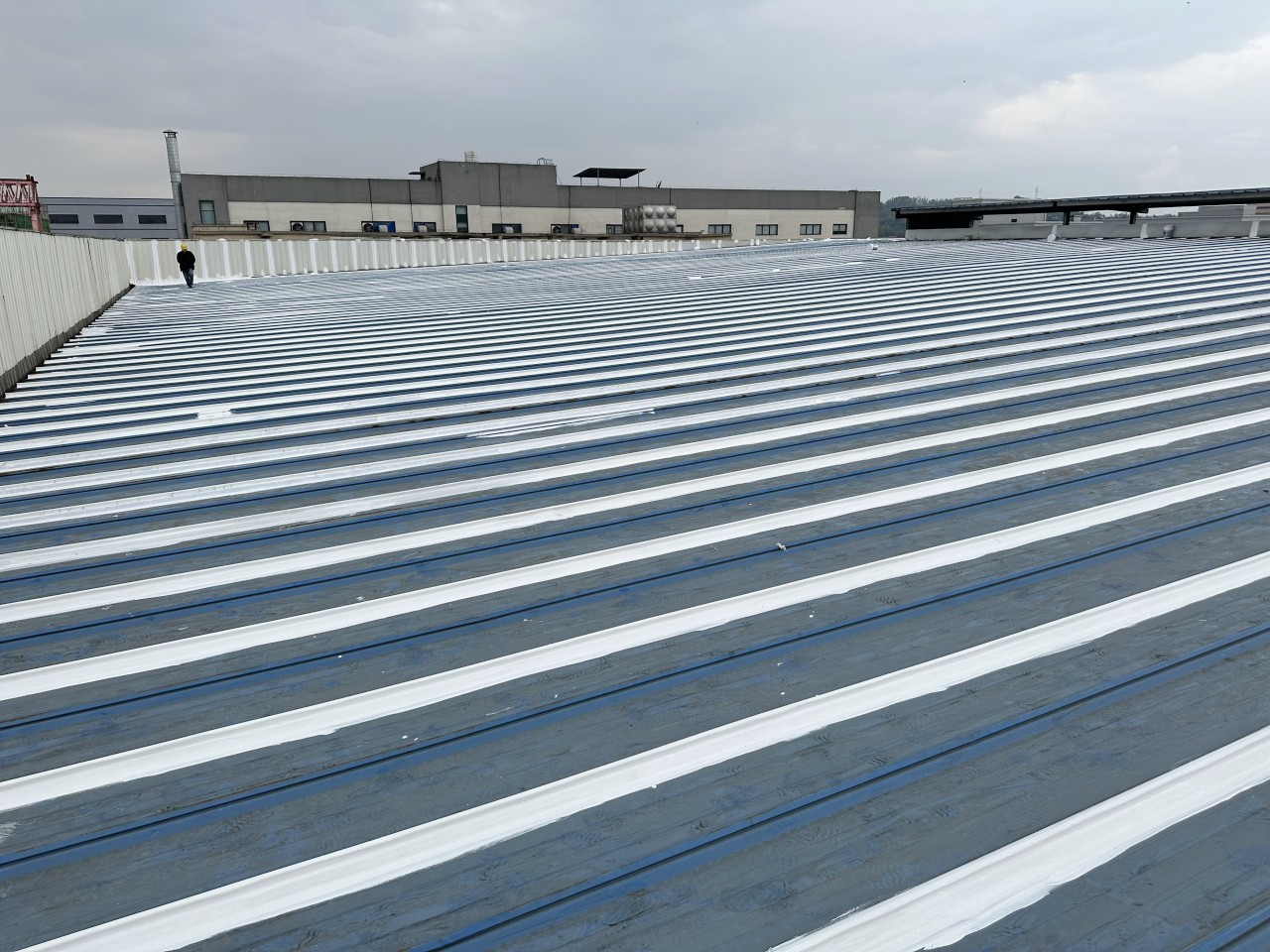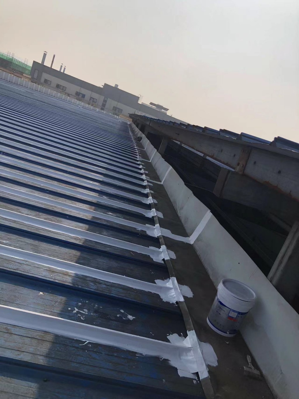 此位于重慶市榮昌區(qū)榮升路103號(hào)的鋼結(jié)構(gòu)廠(chǎng)房是已經(jīng)修建好了近十年了,最近一兩年逐漸出現(xiàn)了彩鋼頂漏雨的情況,開(kāi)始的時(shí)候漏水點(diǎn)還不是很多,逐漸的漏水點(diǎn)越來(lái)越多,影響到了廠(chǎng)房?jī)?nèi)部的生產(chǎn)活動(dòng),業(yè)主方開(kāi)始也找其他公司進(jìn)行過(guò)一些修補(bǔ)施工,但是效果不是很理想,之前的施工方采用的是丁基膠帶進(jìn)行粘貼密封修補(bǔ)的,但是沒(méi)有過(guò)多久,那丁基膠帶就開(kāi)裂了,又漏雨了,客戶(hù)找到我們公司,我們公司根據(jù)現(xiàn)場(chǎng)查勘之后,定制了適合現(xiàn)場(chǎng)實(shí)際的施工方案,采用SYR金屬屋面防水涂料配合縫織聚酯布針對(duì)彩鋼頂?shù)牟输摯罱涌p、中間固定螺釘、彩鋼板的一些破損孔洞部位進(jìn)行一布三涂的方式進(jìn)行防水補(bǔ)漏施工,客戶(hù)看了施工方案之后比較滿(mǎn)意,然后又考察了采用SYR金屬屋面防水涂料施工的其他地方的工地之后,最終確定由我公司對(duì)此彩鋼頂進(jìn)行全面的防水補(bǔ)漏處理。