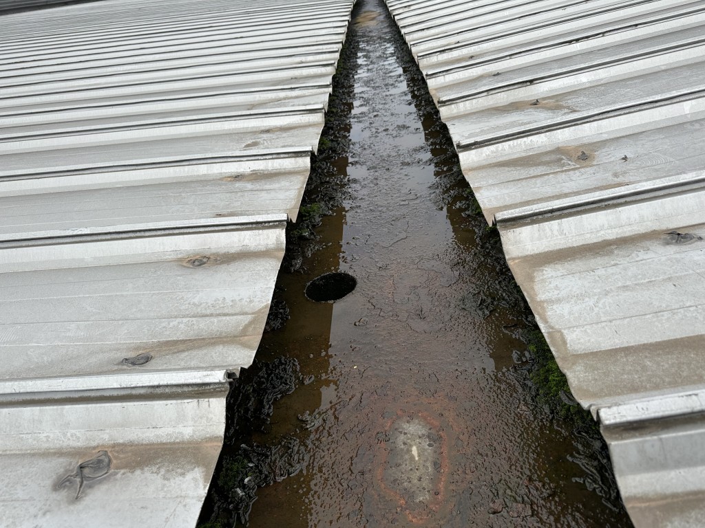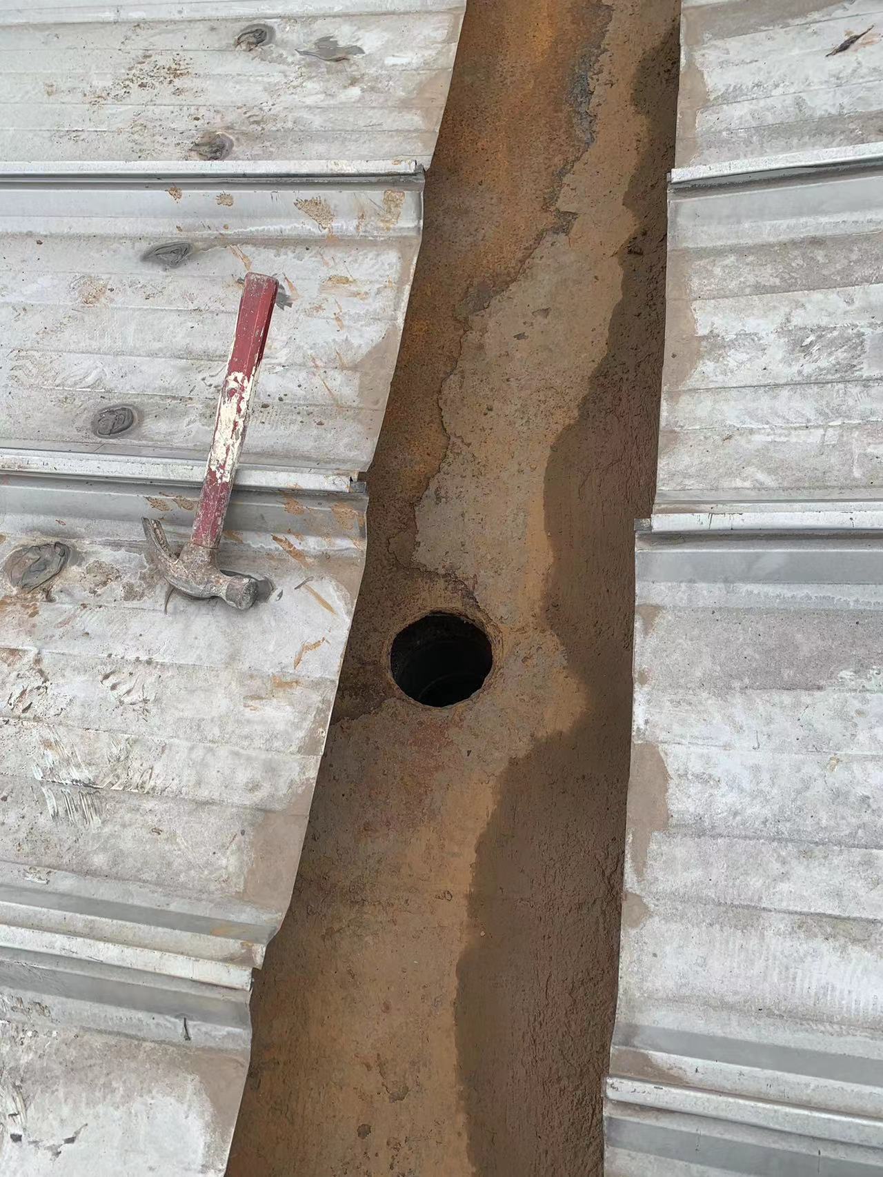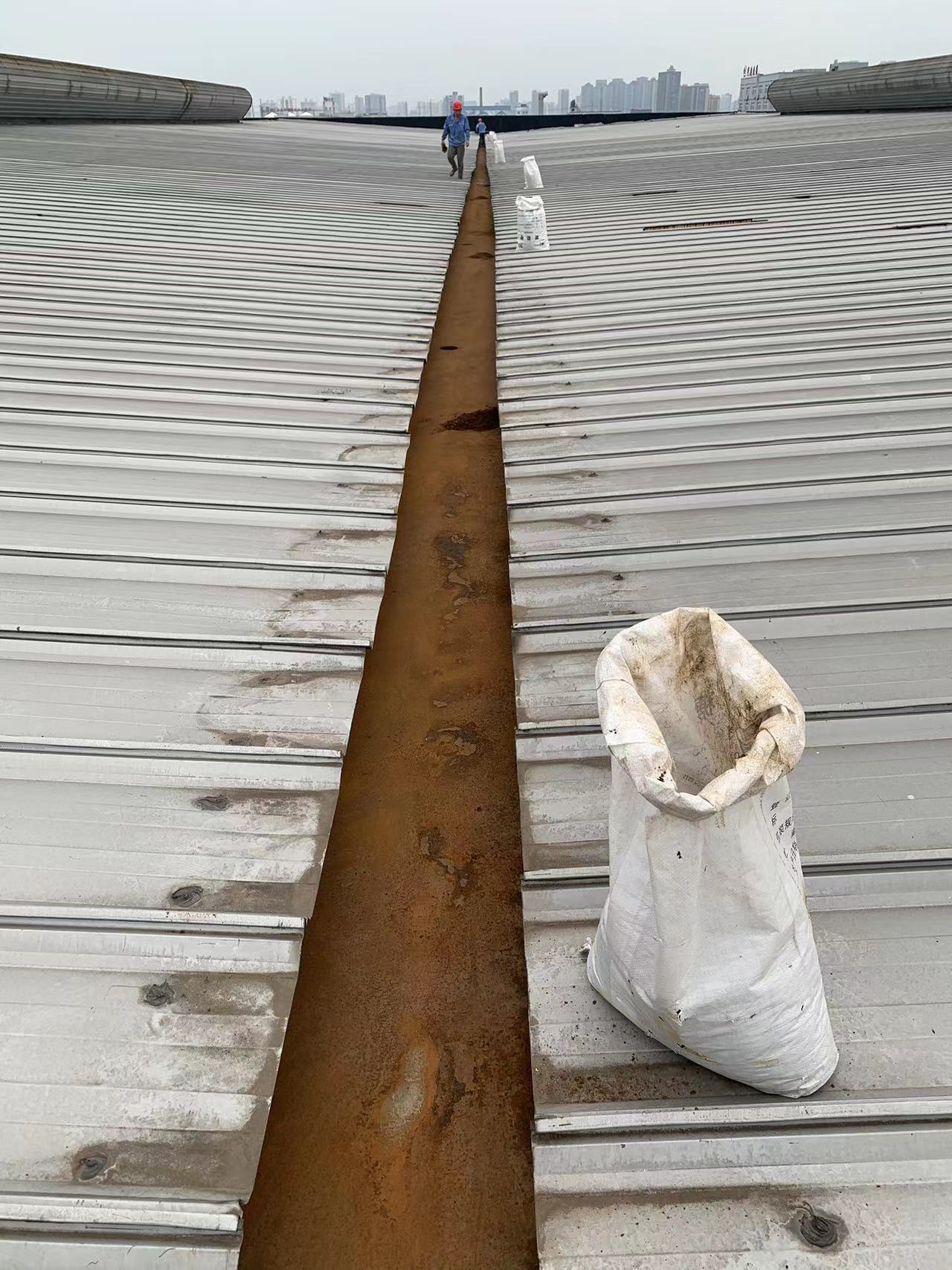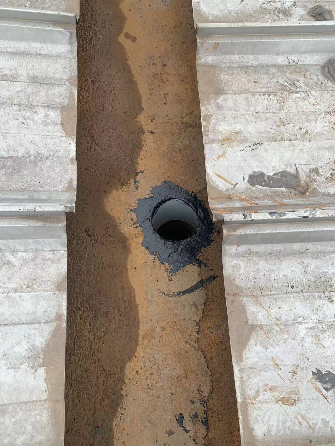 該廠房的彩鋼頂天溝在長期受到酸雨侵蝕下,天溝內(nèi)個別下水管口銹蝕爛掉,導(dǎo)致雨水在降雨時從漏斗旁滴落,造成下水管周邊漏雨。同時,天溝內(nèi)部的鐵板也出現(xiàn)了嚴重的銹蝕現(xiàn)象,已經(jīng)出現(xiàn)起殼脫層,如果不及時處理,天溝可能會銹蝕穿孔,導(dǎo)致漏水,對廠房的生產(chǎn)設(shè)備及安全生產(chǎn)構(gòu)成威脅。