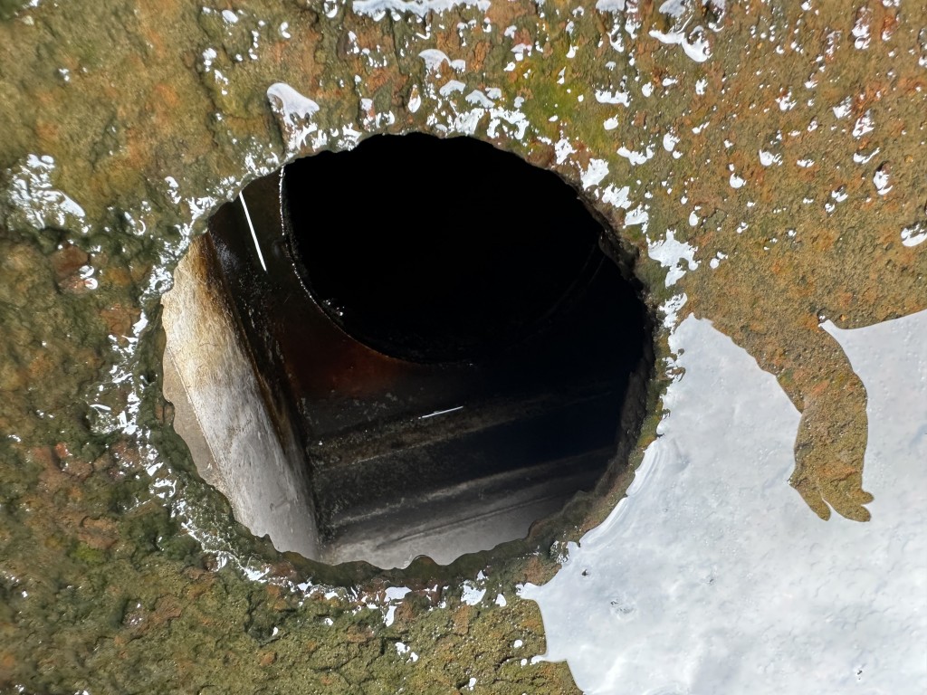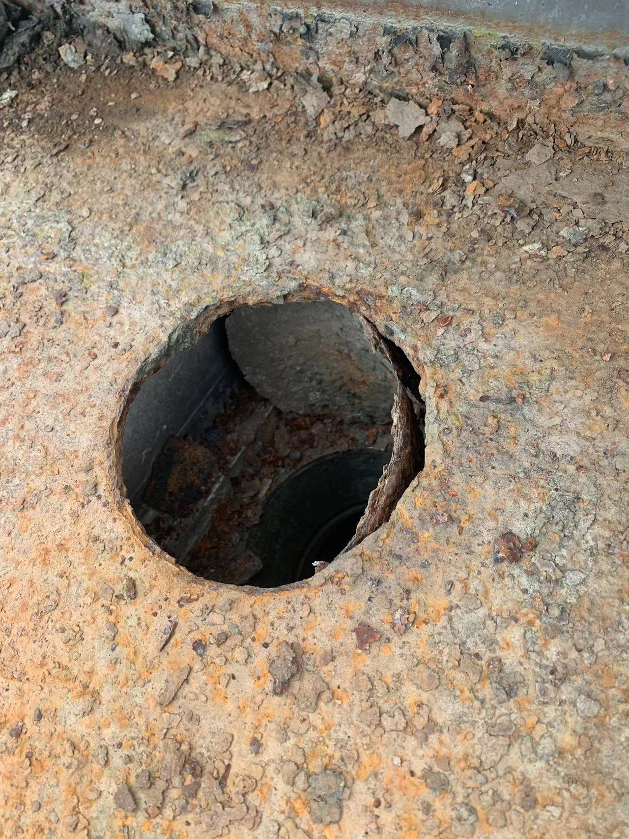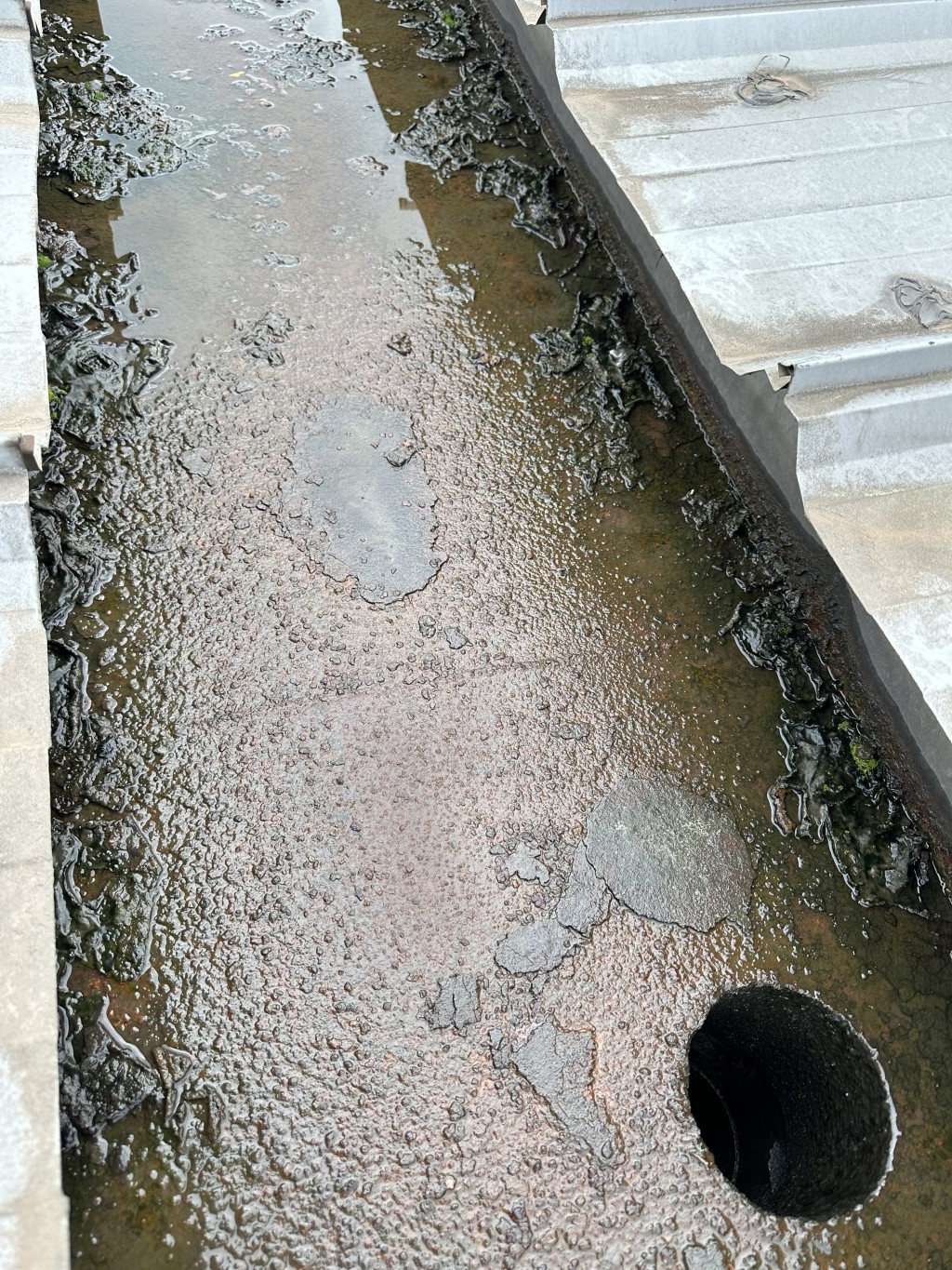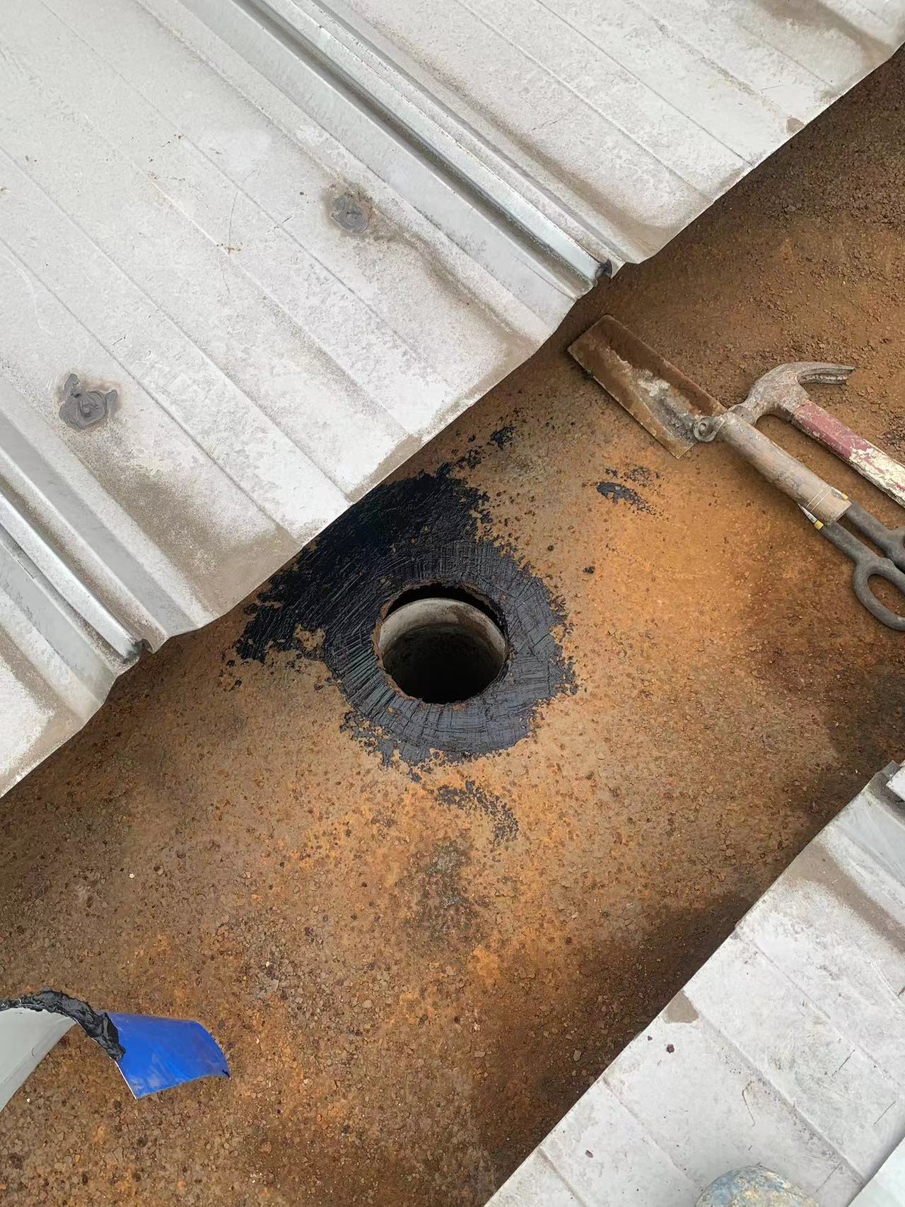 該廠房的彩鋼頂天溝在長期受到酸雨侵蝕下,天溝內(nèi)個別下水管口銹蝕爛掉,導(dǎo)致雨水在降雨時從漏斗旁滴落,造成下水管周邊漏雨。同時,天溝內(nèi)部的鐵板也出現(xiàn)了嚴重的銹蝕現(xiàn)象,已經(jīng)出現(xiàn)起殼脫層,如果不及時處理,天溝可能會銹蝕穿孔,導(dǎo)致漏水,對廠房的生產(chǎn)設(shè)備及安全生產(chǎn)構(gòu)成威脅。