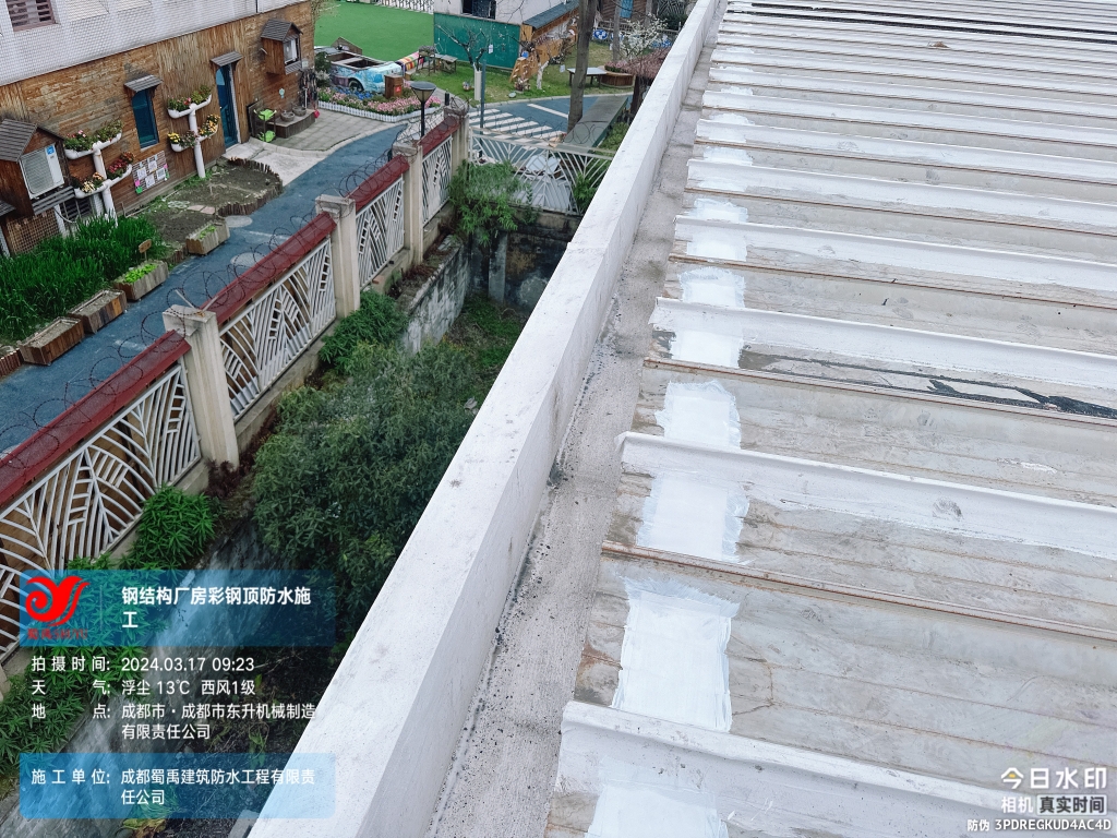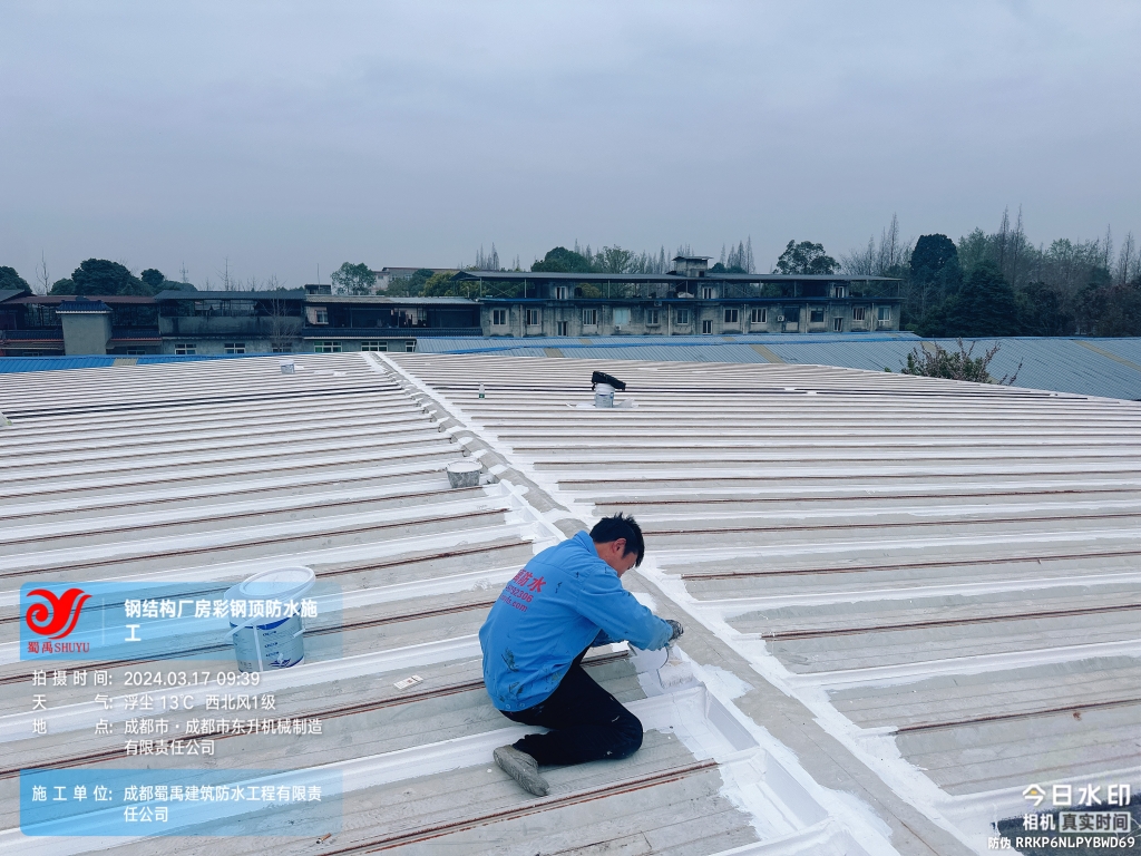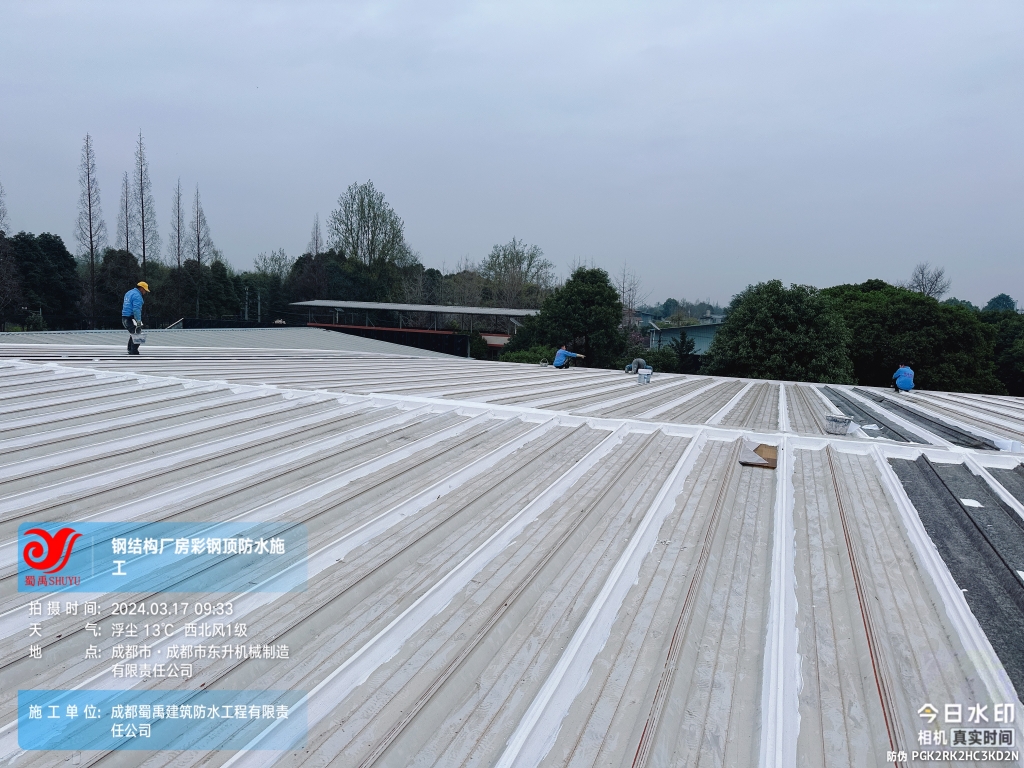近日,成都蜀禹建筑防水工程有限責任公司成功完成了成都市東升機械制造有限責任公司位于溫江區廠房的彩鋼頂及天溝防水補漏工程。此次工程旨在解決廠區內廠房彩鋼頂屋頂表面的彩鋼瓦接縫、固定螺釘、天溝等部位的防水問題,確保廠房的防水性能得到有效提升。