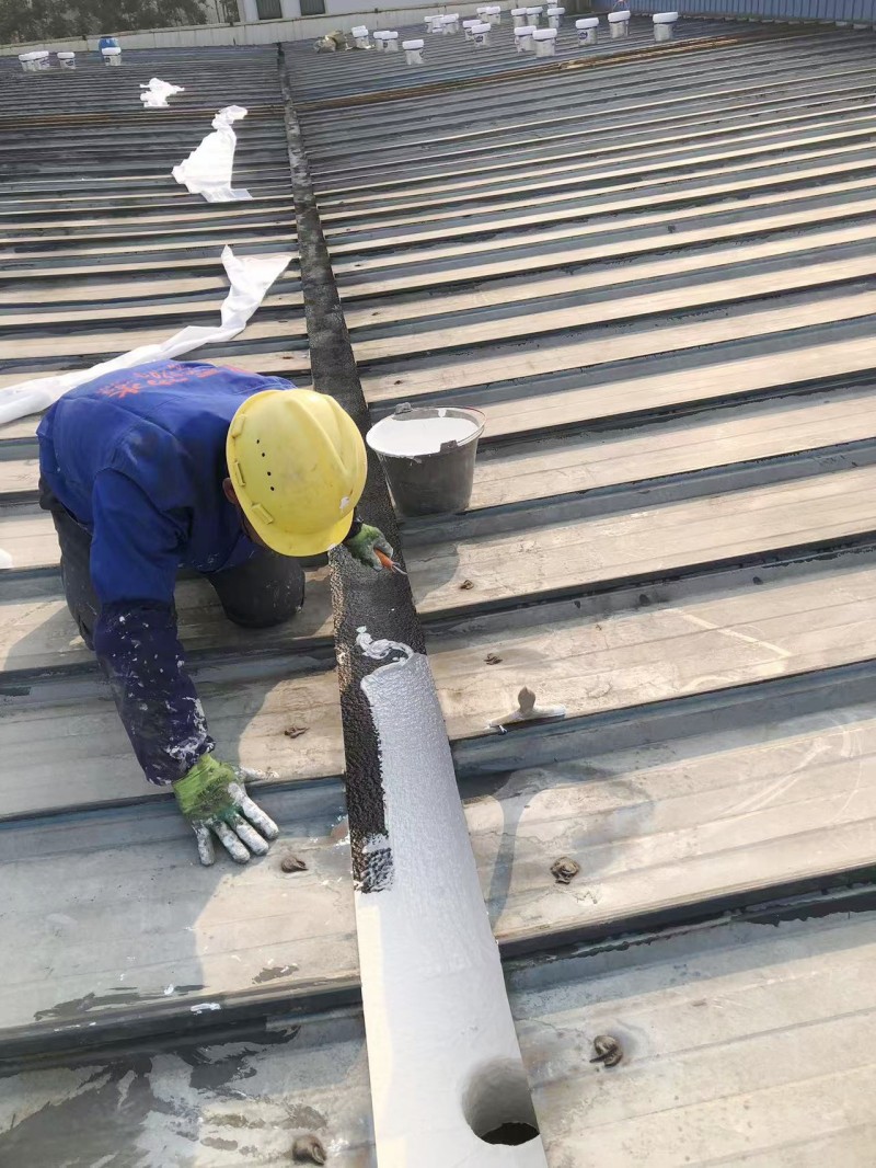 重點部位處理:針對彩鋼瓦搭接縫以及固定螺釘部位,涂刷 15cm 寬的 SYR 金屬屋面專用防水涂料,形成初步的防水屏障。隨后,在這些部位鋪貼防水專用縫織聚酯布,利用聚酯布的高強度和良好的延展性,增強防水效果,防止因屋面變形導致的開裂漏水。接著,在搭接縫和固定螺釘表面再涂刷第二遍 SYR 金屬屋面專用防水涂料,進一步鞏固防水層。