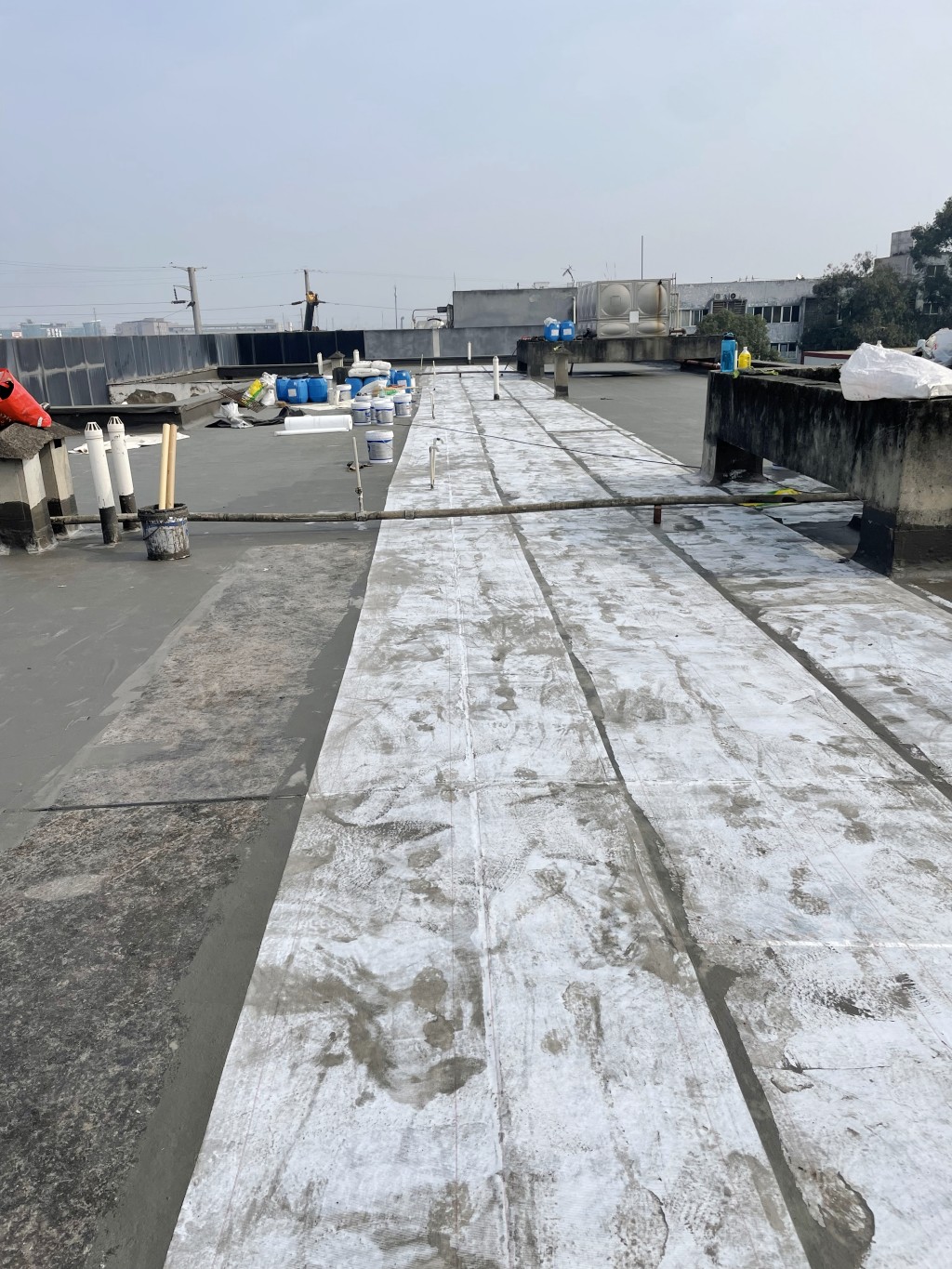 基層修補處理:對屋頂表面破損的基層進行仔細修補處理,將松動、破損的部分清理干凈,然后采用混凝土液體硬化劑進行基面固化處理,為后續(xù)防水施工提供堅實基礎(chǔ)。
