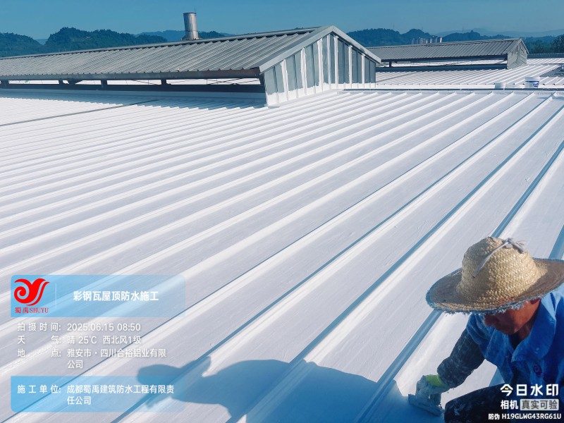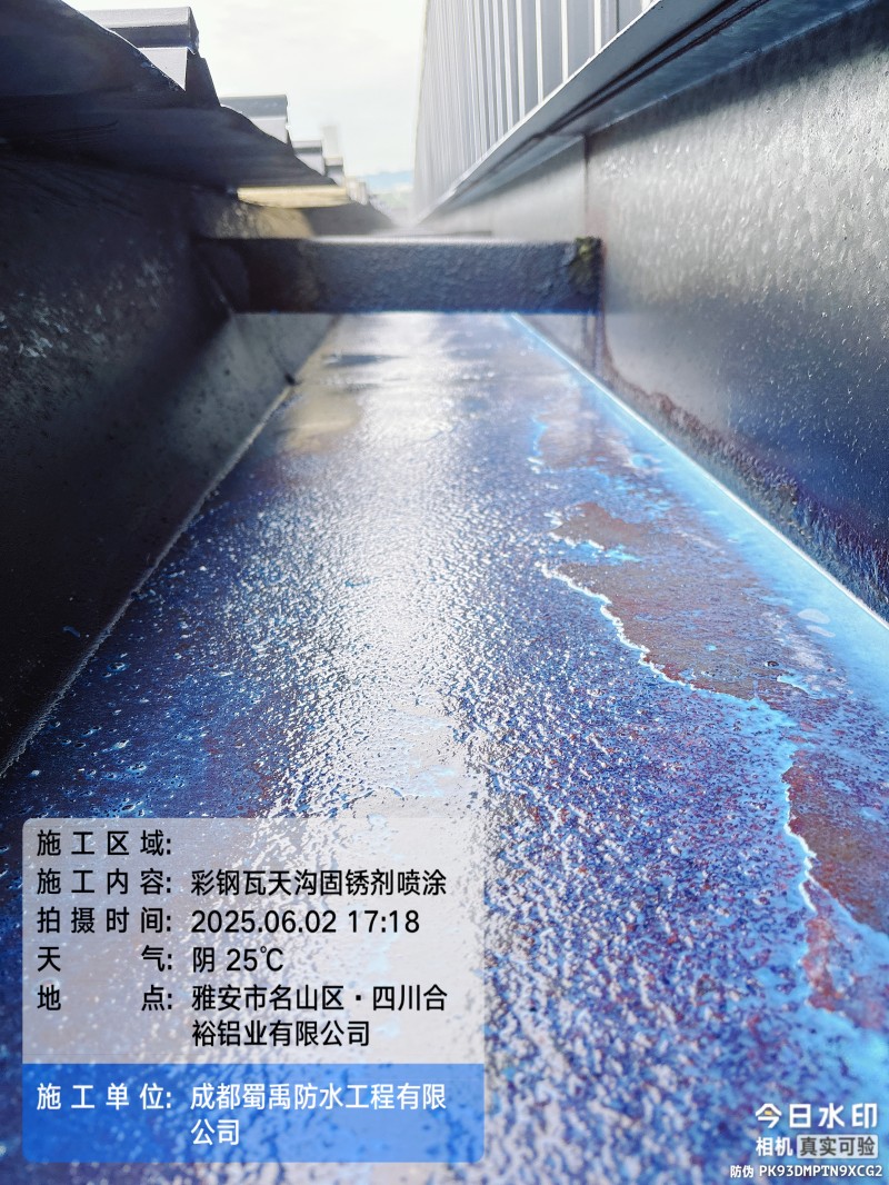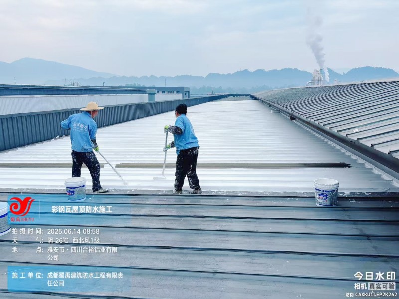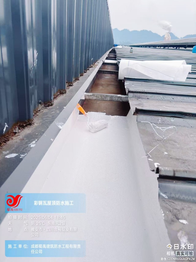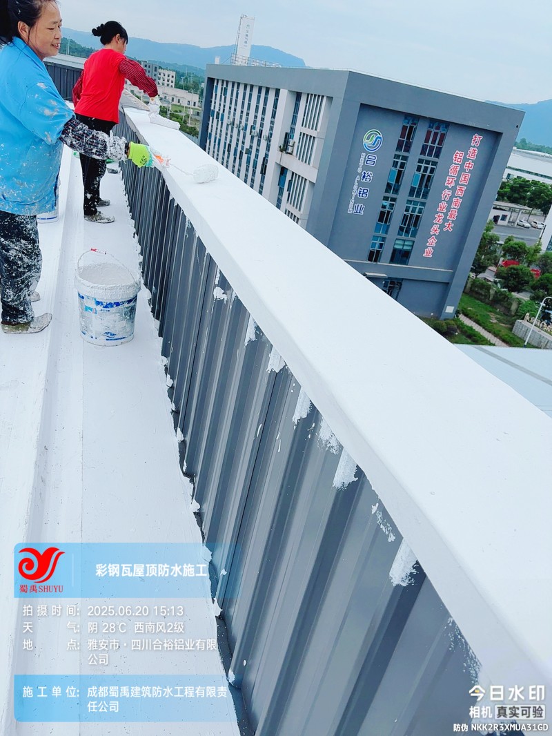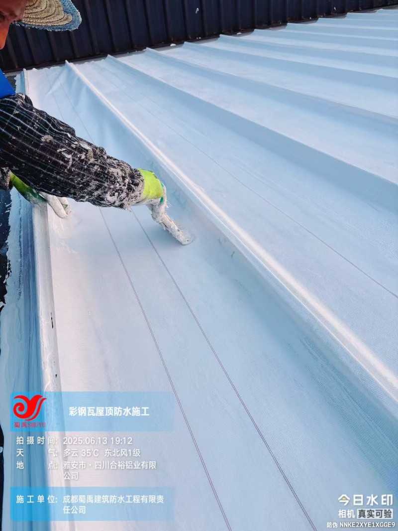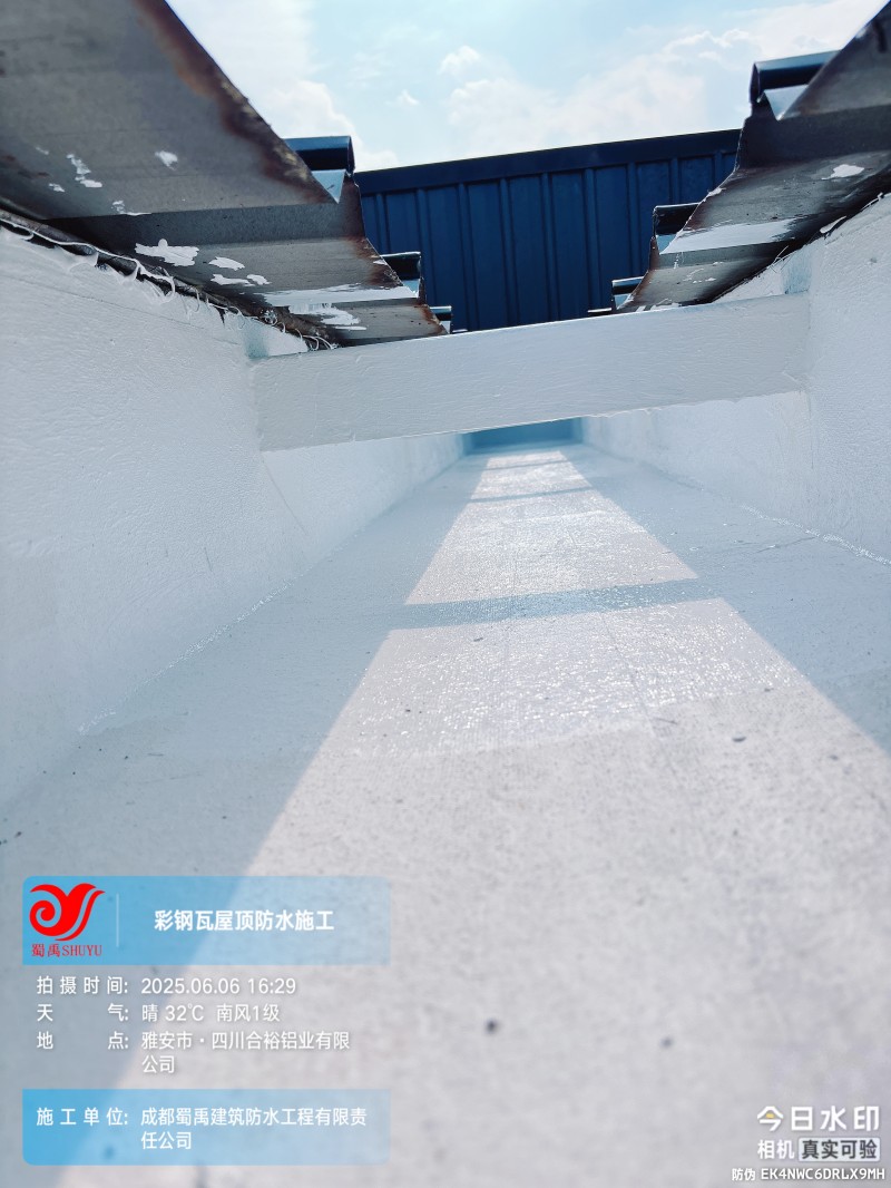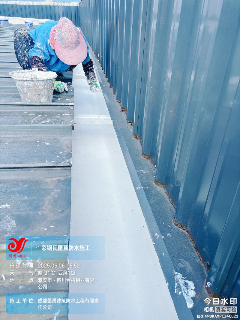 此次四川合裕鋁業 2 號鋼結構廠房屋頂防水補漏防腐翻新工程,蜀禹防水團隊嚴格按照施工方案與技術標準開展作業,從基面處理到涂層涂刷,每一個環節都做到精細化把控。通過采用 SYR 金屬屋面無縫防水系統,結合科學的施工流程,成功解決了廠房屋面的漏水問題,同時為彩鋼瓦屋面提供了長期的防腐保護。